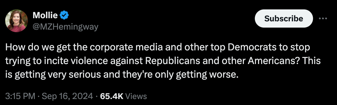 When Donald Trump says anything it’s an incitement to violence, even when the violence is theoretical at best and imaginary in reality, but when a Democrat in good-standing with the corporate media, military industrial complex, and Deep State spouts the same talking points as a man who actually attempted to kill Donald Trump it is not incitement to violence. Mollie Hemingway of The Federalist tried to hold these people accountable to their own standard on X.